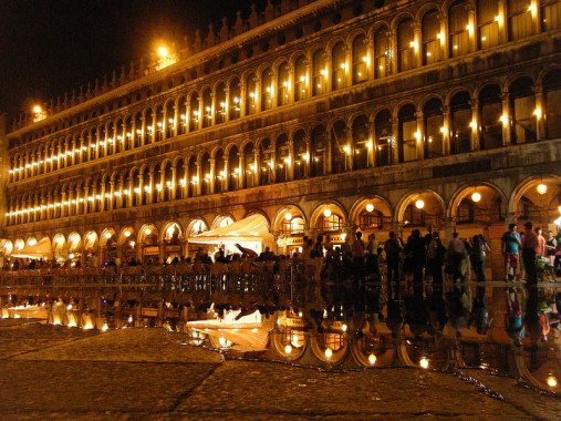 Venice at Night – www.AFriendAfar.com Previous Next Published September 4, 2015 at 800 × 600 in Venice at Night – www.AFriendAfar.com Another great Shot of the Week! Doesn’t a little bit of acqua alta (“high water”) in the Piazza di San Marco in Venice look so dreamy at night? We can just hear the music coming from the orchestra under the lights.